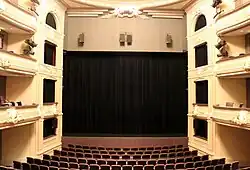 The main room of the Schouwburg is relatively small for current standards,[3] and can seat 680 people in total with the main room and three balconies.[4] The stage has a 1929 antique revolving stage that is still functional but no longer in use.[3] It is considered one of the most prestigious theaters in the country.
