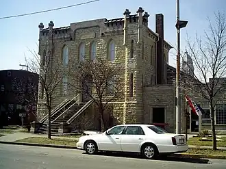Front and side of the Kosciusko County Jail, located at the intersection of Main and Indiana Streets in Warsaw, Indiana, United States.