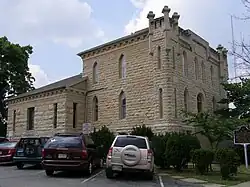 The "Castellated Gothic" design represents the late 1800s American jail design standards. The massive, rough stone blocks suggest a feeling of strength and permanence. Narrow windows and second story main entrance imply the restrictive function of the structure. To stop future jailbreaks, iron dowel rods pierced the stone blocks. This would prevent the stones from being pushed out. The jail was completed in 1870, one block east of the courthouse square. The cost was $48,000, and the builder was Richard Epperson.[2]