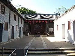 The Yamen (衙府) is located in the centre of the Park and is the only remaining old Qing building. It was built in 1847; its interior was dominated by the offices of the Commodore of the Dapeng Brigade (大鵬協府) and the Kowloon Assistant Military Inspectorate (九龍巡檢司衙署). It was designed with three rows and four wings of houses. Its walls and column bases are built from bricks and granite, while the roof is a traditional structure covered with cylindrical and flat tiles. After 1899 the Yamen was used for charitable purposes, like housing elderly. It is now officially classified as a declared monument in Hong Kong. Six exhibition rooms are housed inside.[7]