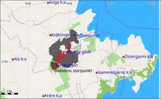 The early summer of 1992 was unusually warm with little rain, leaving the ground extremely dry.[21] On 9 July there was a moderate gale of about 7 on the Beaufort scale, coming from the south. The fire, probably started by a burning cigarette,[22] started in the southern part of Torsburgen, a couple of hundred meters north of the Arde opening.[12] The fire spread rapidly and soon developed into a canopy fire. Due to the wind a fire storm, about two kilometers wide, formed and advanced north toward Hajdeby farm and Kräklingbo church.[19] The fire had three fronts. Two flanks, each approximately 6 km (3.7 mi) wide, slowly spreading outwards and a 2.5 km (1.6 mi) wide front advancing very rapidly in the north.[19]