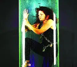 Johnson's signature escape is the Full View Water Torture Cell, in which she is chained up and locked inside a water filled tank from which she escapes in full view of the audience. The full view aspect differentiates it from Houdini's Chinese Water Torture Cell escape, which required a curtain to be drawn to obscure him from the audience while he escaped.[5] She performed the original version of the stunt as part of the Worldwide Escape Artist's Relay in 2005, which was an attempt to set a world record for the largest number of escapes performed in a day.[6]