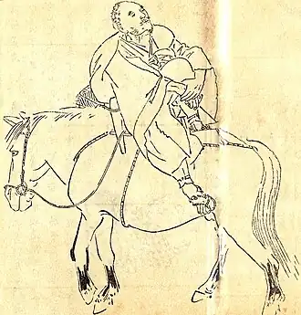 Kumagai is often depicted riding his horse backwards. Though likely more myth than historical fact, he is said to have been determined to always face towards the Western Paradise of Amida, even when riding to the east, as part of his penance and devotion.[1]