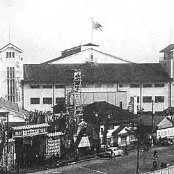 The Sumo Association has owned the site of the former Tokyo Technical High School at the base of Kuramae Bridge since before World War II. The construction plan for the new Kokugikan was underway since around 1940 but was suspended due to the war. After the war, the old Kokugikan was occupied by the allied forces enforcing the budo ban,[1] forcing the Japan Sumo Association to hold tournaments and Sumo venues in shrines and baseball stadiums.[3] Due to resource shortages after the war, the beginnings of the arena were built using the scraps from the demolition of the naval hangar of Atsugi.[4] The target capacity was 11,000 spectators. From 1950 to 1953, main tournaments were held at the Kuramae Kokugikan, which was still under construction.