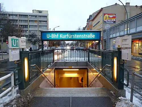 Kurfürstenstraße is a Berlin U-Bahn station on lines U1 and U3. The station opened on 24 October 1926 and is located in the Berlin Mitte borough.