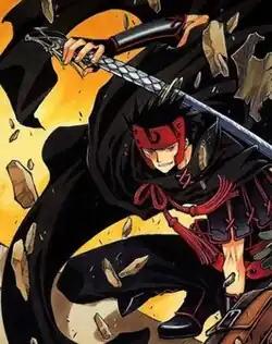 Kurogane is a rough-mannered ninja from the world of Japan, who is sent away from his world by Princess Tomoyo in order to have him discover his true strength. He is the most powerful warrior in his world, but he shows no mercy to anyone, so Tomoyo places a "curse" on him that will decrease his strength if he kills anyone. He gives up his replica of the sword, Ginryū (銀竜; lit. "Silver Dragon"), as the price to use Mokona to cross dimensions and return to his home world.[7] He quickly bonds with the group, to the point he starts tutoring Syaoran.[8] He is constantly teased by Fai, who calls him a variety of nicknames, though he also is able to tell Fai's true nature.[9] However blunt and crude Kurogane may act, he is actually quite observant and perceptive, being always acutely aware of his surroundings.