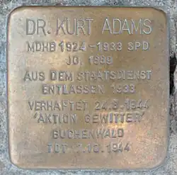 5. ^ a b "Kurt Adams MdHB". Dr. Rita Bake & Peter Hess iA Erinnerungs-Projekt Stolpersteine in Hamburg. Retrieved 14 November 2015.