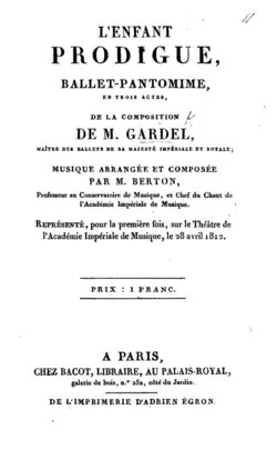 2. ^ Gardel, P. (1818). L'enfant prodigue: Ballet-pantomime en 3 actes. De la composition de M. Gardel,... Musique arrangée et composée par M. Berton,... Représenté, pour la 1ère fois, sur le Théâtre de l'Académie impériale de musique, le 28 avril 1812. France: Roullet.