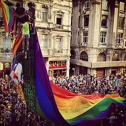 Under AKP's rule, state repression became more intense. In 2014 the pride march counted more than 100,000 participants, making it one of the biggest pride marches in Southeastern Europe, and politicians of the main opposition parties, CHP and BDP, lent their support to the demonstration.[17] As a consequence, the following year, Turkish authorities stopped and the annual pride parade in Istanbul through violence, making use of tear gas, rubber bullets and water cannons against the marchers.[18][19]