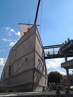 For this project, the previous foundations had to be demolished as they did not align with the intended design.[3] The boat design was modeled after the first vessel to set foot on Aztec land, La Santa María.[13] However, for cultural reasons, pre-Hispanic motifs were added, such as fretwork, pyramids, sculptures of Quetzalcóatl, among others. To simulate the sea, mini-pools were created. Waves were formed on one side using grass.[14] The temple was consecrated by Monsignor José Trinidad Medel.