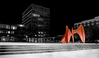 The Civic Center in which the sculpture is sited was designed by Chicago architectural firm Skidmore, Owings and Merrill. The site features two black, rectilinear, curtain-walled buildings for City Hall and Kent County, surrounded by a concrete plaza. The county building, which is shorter with a larger footprint, features an enlarged reproduction of a Calder painting on its roof.[7] The construction and sculpture projects were part of a downtown urban renewal effort. The area is formally named Vandenberg Plaza, after Senator Arthur Vandenberg, but is popularly referred to as Calder Plaza.