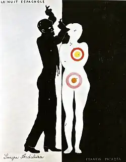 The painting is divided in two halves, each one depicts two black and white silhouettes, one male and the other female. The black silhouette of the man is on the left side, while the white silhouette of the woman is at the right side. On the left top of the canvas it reads the title "La Nuit Espagnole", in French. At the bottom left it reads "Sangre Andaluza" (Andalucian blood), in Spanish. The signature of the artist appears at the bottom right. The meaning of the work is complicated by the presence of two colored targets on the female figure, one at her chest and the other at her belly, but also by the strange position of the man, who raises his arms and hands open to her. It can be seen as representing a knife thrower, a banderilla planter or a fandango dancer.[1][2]