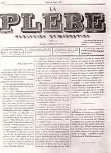 Enrico Bignami founded La Plebe in Lodi in 1868 to promoted Giuseppe Mazzini's ideas, financing the paper from his import business.[1] The first issue appeared on 4 July 1868. At first it was published bi-weekly, although for periods during the years that followed it appeared more or less frequently. The paper would last until 1883, despite seizures of issues and several arrests of the editor. It gave continuity from the left wing of the Risorgimento to the post-unification labor movement and the later elaboration of socialist ideology in northern Italy.[2]