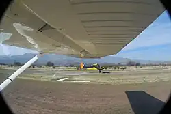 A Cessna 172 waits while an ultralight aircraft lands on runway 21 in La Victoria de Chacabuco (SCVH)