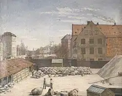 Christian III built a farm referred to as Ladegården about which hardly anything is known at Nyby outside Copenhagen 1548. The building later associated with the name was established by Christian IV in 1623. The estate covered all of present-day Frederiksberg Municipality. Its purpose was to provide produce for the royal household, grazing for its livestock and feed for the royal mews. A building g with room for 500 pieces of cattle was destroyed in a storm in 1628 and a new, three-storey brick building was constructed in its place.[1] The complex was surrounded by bastions and a moat that was fed with water from the Ladegård Canal as well as Rosenåen, a branch which emptied into the sea at Kalvebod Beach. The farm was never an economic success and some of the land was sold off to a group of Dutch farmers from Amager. The building was destroyed during the Swedish siege of Copenhagen in 1658-59.