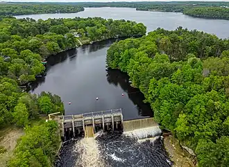 The lake was created by impounding the Eau Claire River with the construction of the Altoona 2WP340 Dam in 1938, with a concrete spillway and sluice gates on the western end of the reservoir.[2] (The "2WP340" refers to the permit number of the Public Service Commission of Wisconsin authorizing the dam.) The dam is owned and operated by Eau Claire County for recreation and water conservation.[3] No hydroelectric power is generated.