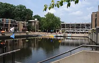 Lake Anne Center was the first village center created in the planned community of Reston, and features a mix of commercial and residential buildings around a plaza and inlet of Lake Anne, a man-made reservoir. The village center was designed by Reston's master planner and architect James Rossant of New York City for Robert E. Simon and built 1963–67. At the time it was considered a showcase of modern community planning; architecturally, it is composed mainly of modestly scaled Brutalist structures, including residential townhouses, mixed commercial-residential buildings, and a church.[2]