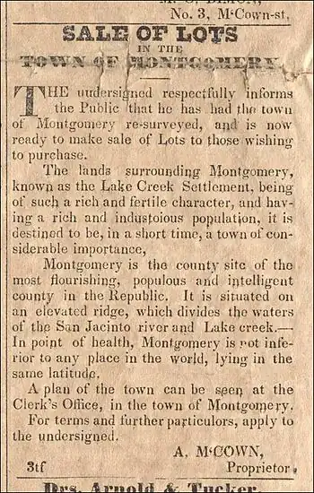 In 1837, W. W. Shepperd, in association with John Wyatt Moody, founded the town of Montgomery, Texas at the site of Shepperd's store in the middle of Lake Creek Settlement. J. W. Moody was the First Auditor of the Republic of Texas and had been Auditor of the Provisional Government of Texas.[23] They advertised sale of lots in the Telegraph and Texas Register, July 8, 1837, published in Houston, Texas.[24]