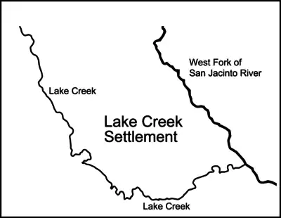By 1833, this settlement between the West Fork of the San Jacinto River and the stream called Lake Creek had already become known throughout Mexican Texas as the "Lake Creek Settlement."[16] It was also commonly referred to as the "neighborhood of Lake Creek," the "District of Lake Creek," the "Precinct of Lake Creek," or simply as "Lake Creek."[16]