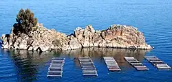 An artificial fish enclosure at a fish farming site near Copacabana, Bolivia