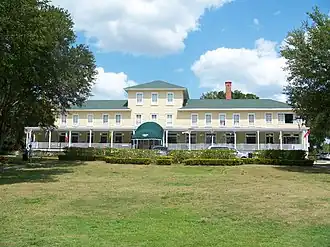 The Lakeside Inn is a historic site in Mount Dora, Florida. It is located at 100 North Alexander Street. On March 19, 1987, it was added to the U.S. National Register of Historic Places. It was for sale in 2010,[1] and purchased by new owners, who planned to renovate it, later that year.[2] The Lakeside Inn, originally named the Alexander House, was built in 1883 by the partnership of Col. John M. Alexander, Col. John A. McDonald (real estate dealer from Eustis), and his daughter, Annie McDonald Stone. The partners hired Caroline Bruce to manage the ten-room inn as they were busy with other interests. In 1895, Caroline Bruce left in order to start her own establishment, the Bruce House. Management of the hotel shifted to Emma Boone and it was renamed the Lake House. Boone married George D. Thayer in May of 1903, and Thayer formed a stock company to operate the hotel. Boone died in 1909 and Thayer continued management of the hotel after remarrying in 1920 to Dora Berry Thayer, until his retirement in 1924. The Gatehouse was built in 1908 and the Sunset Cottage was built in 1914. The hotel was sold to Archie Hulbert, an experienced hotel operator from Boston. A three-story center, dining room, kitchen, and circular driveway were added. Operation was then shifted over to Lakeside Inn Properties Inc. (headed by Charles Edgerton and Fred Wentworth) in 1933.[3][4] It is the oldest continuously operating hotel in the State of Florida and the last of the Grand Victorian Era Hotels still remaining in Central Florida and is said to be the most historic hotel there. Throughout its 130-year history, Lakeside Inn has hosted many noted dignitaries and celebrities, including President Calvin Coolidge and First Lady Grace Coolidge, for a month-long stay in the winter of 1930. Lakeside Inn has also been distinguished as the number one venue in the Central Florida Lakes Region for wedding ceremonies and receptions