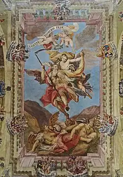 The ceiling features a fresco by Fromiller framed by elaborate mock architecture designed with perspective in mind. The surrounding portico includes niches with Grisailla statues of the Habsburg rulers Matthias, Ferdinand II, III, and IV. Instead of a celestial depiction, the fresco portrays the hereditary homage of Emperor Charles VI, which took place on August 22, 1728, in the Palais Rosenberg (now the town hall of Klagenfurt). The emperor is depicted under a red canopy, surrounded by deputies, ecclesiastical dignitaries, the duke’s farmer, and holders of eleven provincial offices. The coats of arms of these figures, along with those of Austria, Carinthia, and the ecclesiastical territories of Salzburg and Bamberg, are integrated into the design.