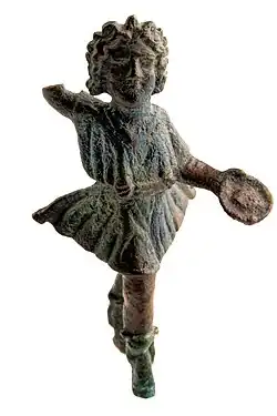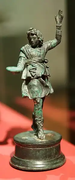Archaic Rome's Etruscan neighbours practised domestic, ancestral, or family cults very similar to those offered by later Romans to their Lares.[2] The word itself seems to derive from the Etruscan lar, lars, or larth, meaning 'lord'.[3][4] Ancient Greek and Roman authors offer 'heroes' and 'daimones' as translations of Lares; the early Roman playwright Plautus (circa 254–184 BC) employs a Lar Familiaris as a guardian of treasure on behalf of a family, as a plot equivalent to the Greek playwright Menander's use of a heroon (as an ancestral hero-shrine).[5] Weinstock proposes a more ancient equivalence of Lar and Greek hero, based on his gloss of a fourth-century BC Latin dedication to the Roman ancestor-hero Aeneas as Lare (Lar).[6]