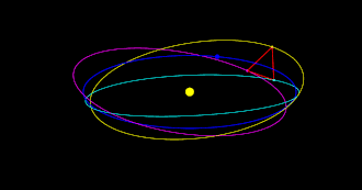The LISA mission's primary objective is to detect and measure gravitational waves produced by compact binary systems and mergers of supermassive black holes. LISA will observe gravitational waves by measuring differential changes in the length of its arms, as sensed by laser interferometry.[12] Each of the three LISA spacecraft contains two telescopes, two lasers and two test masses (each a 46 mm, roughly 2 kg, gold-coated cube of gold/platinum), arranged in two optical assemblies pointed at the other two spacecraft.[13] These form Michelson-like interferometers, each centred on one of the spacecraft, with the test masses defining the ends of the arms.[14] The entire arrangement, which is ten times larger than the orbit of the Moon, will be placed in solar orbit at the same distance from the Sun as the Earth, but trailing the Earth by 20 degrees, and with the orbital planes of the three spacecraft inclined relative to the ecliptic by about 0.33 degree, which results in the plane of the triangular spacecraft formation being tilted 60 degrees from the plane of the ecliptic.[12] The mean linear distance between the formation and the Earth will be 50 million kilometres.[15]