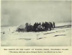 McConnell left Point Barrow for Nome aboard King and Winge, an American-registered walrus hunter, while Bear finally sailed for Wrangel Island.[109][110][111] On 25 August Bear was stopped by ice 20 miles (32 km) from the island, and after failing to force a way through, Cochran had to return to Nome for more coal—a decision which, says Bartlett, gave him "days to try a man's soul".[112] Back in Nome Bartlett met Olaf Swenson, who had chartered King and Winge for the season and was about to sail for Siberia. Bartlett requested that, if possible, King and Winge stop by Wrangel Island and look for the stranded Karluk party. Bear left Nome on 4 September, a few days after Swenson's ship.[113] King and Winge, with McConnell still aboard, reached Wrangel Island on 7 September. That morning the group at Rodgers Harbor were awakened early in the morning by the sound of a ship's whistle, and found King and Winge lying a quarter of a mile offshore. They were rapidly transferred to the ship, which then picked up the remainder of the stranded party who were camped along the coast at Waring Point. By the afternoon all 14 survivors were aboard.[109][110][114]