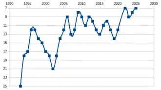 Graph shows Latvian results in IIHF World Championship since 1993.