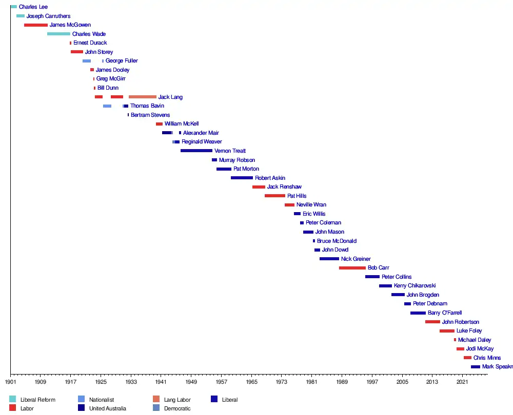 Mark SpeakmanChris MinnsJodi McKayMichael DaleyLuke FoleyJohn Robertson (politician, born 1962)Barry O'FarrellPeter DebnamJohn Brogden (politician)Kerry ChikarovskiPeter Collins (New South Wales politician)Bob CarrNick GreinerJohn Dowd (politician)Bruce McDonald (Australian politician)John Mason (Australian politician)Peter ColemanEric WillisNeville WranPat HillsJack RenshawRobert AskinPat MortonMurray RobsonVernon TreattReginald WeaverAlexander MairWilliam McKellThomas BavinJack Lang (Australian politician)Bill Dunn (Australian politician)Greg McGirrJames Dooley (New South Wales politician)George Fuller (Australian politician)John Storey (politician)Ernest DurackCharles WadeJames McGowenJoseph CarruthersCharles Lee (Australian politician)