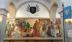Delegates from Venice were present at the meeting.[15] The military alliance[16] was made up of feudal lords in Albania, who had to contribute to the league with men and money.[15] Skanderbeg was proclaimed "Chief of the League of the Albanian People."[15][17] Thus, he was the League's leader and commander-in-chief of its combined armed forces, which numbered 8,000 warriors.[18][19] All the territorial lords had their own domains and affairs; "Skanderbeg had no right to interfere with the affairs of the domains of other nobles", acting only as the supreme military leader, as primus inter pares. [20][21] Barleti referred to the meeting as the generalis concilium or universum concilium ("general council" or "whole council"); the term "League of Lezhë" was coined by subsequent historians.[6]