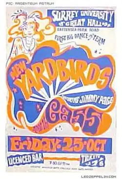 Poster for Led Zeppelin's concert at the University of Surrey (billed as "The New Yardbirds featuring Jimmy Page"), used to help promote its 1968 U.K. tour