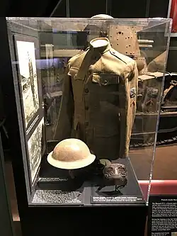 The steel helmet and service coat of Leeds service member John A. Montgomery is currently located at the National WW1 Museum and Memorial in Kansas City, Missouri. Montgomery was assigned to the "...9th Company, 2nd Motor Mechanics Regiment, 2nd Battalion Air Service Mechanics. The 2nd Battalion was attached to the French Tank Corps 4 May 1918 to 13 December 1918 and employed in the repair of French Renault and Schneider tanks. On 5 December 1918, French General Estienne gave the 2nd Battalion Air Service Mechanics permission to wear the insignia of the French Tank Corps." The helmet and service coat both bear the insignia of the French Tank Corps.