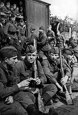 The initial intention was to create an army with seven divisions, but eventually 10 divisions were raised.[1] The Army began formation on 29 June, and by 2 July, 45,183 people had been accepted as volunteers, with a proposal for a 200,000-strong Army being made by the city Communist Party Committee with a view of expansion to 15 divisions according to the number of rayons in the city. By 4 July, the number of volunteers had increased to 77,413б, and by 6 July reached 96,776.