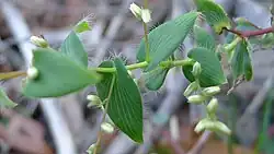 Leucopogon amplexicaulis is a weak, scrambling or straggly shrub that typically grows to a height of up to 90 cm (35 in), its branchlets covered with fine hairs. The leaves are egg-shaped and stem-clasping with a heart-shaped base, 9.5–34 mm (0.37–1.34 in) long and 4.5–20 mm (0.18–0.79 in) wide on a petiole 1–2 mm (0.039–0.079 in) long. The edges of the leaf are fringed and the lower surface is covered with soft or velvety hairs. The flowers are white and arranged in groups of three to twelve along spikes up to 37 mm (1.5 in) long and longer than the leaves. The sepals are 2.1–3.1 mm (0.083–0.122 in) long with bracteoles 1.1–1.3 mm (0.043–0.051 in) long at the base. The petal tube is 1.2–1.9 mm (0.047–0.075 in) long with lobes 1.2–2.6 mm (0.047–0.102 in) long with soft hairs inside the tube. Flowering occurs from July to October and is followed by flattened, glabrous drupe about 3.5 mm (0.1 in) long.[2][3][4][5]