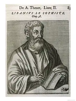 Libanius (Ancient Greek: Λιβάνιος, romanizedLibanios; c. 314–392 or 393) was a teacher of rhetoric of the Sophist school in the Eastern Roman Empire.[1] His prolific writings make him one of the best documented teachers of higher education in the ancient world and a critical source of history of the Greek East during the 4th century AD.[2] During the rise of Christian hegemony in the later Roman Empire, he remained unconverted and in religious matters was a pagan Hellene.