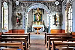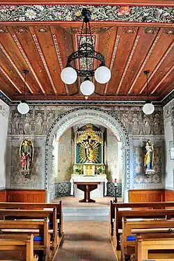 On its eastern side, a five-sided closed choir was added in 1675. Two ogival north-facing windows and one south-facing window illuminate the nave, two arched windows illuminate the choir. The interior is decorated with neo-Gothic furniture and, on occasion of the extensive renovation works in 1917, with Art Nouveau paintings.[1]