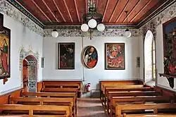 In 1916/17 the interior with the small choir was redesigned fundamentally as the then designers sought a "stylistic unification" with the parish church that had to be renewed in 1885. The original plaster ceiling was replaced by a wooden ceiling according to the Gothic style, as well as the seating and the vault of the choir. Jean Rotenfluh, a native of Rapperswil, carried out the decorations, only the decorative painting, as the angel in the choir arch, have Art Nouveau elements. The semicircular chancel arch is decorated on its side walls with the figure of a guardian angel with child and a statue of Joseph with the infant Jesus. The originally Baroque altar stands today in the Saint Pancras church in Bollingen; it was replaced by a neo-gothic altarpiece whose center is a lovely statue of Our Lady. Due to the liturgical reform in 1979, a simple altar table was added. The original Gothic windows were widened, and the interior designed for the purposes of historicism. Inside the church, the wall paintings from the 17th century were unfortunately removed, and the walls decorated with oil paintings from the late Gothic and the Baroque periods with religious motifs: The wooden relief with Christ on the Mount of Olives by an unknown woodcarver originates around 1530, just as the late-Gothic Crucifixion panel. One painting on the back wall dates from the Baroque and presents Mary as intercessor for the poor souls, the oval image of Aloysius Gonzaga may be a work by the Rapperswil artist Elisa (Louise) Fornaro (1726–1796).
