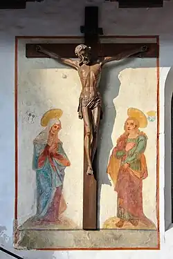 The crucifixion scene at the staircase on the south side was created in the 17th century when Maria and Magdalena were painted on plaster on either side of a wooden crucifix. On the cross hung a corpus from the period around 1490, part of the late Gothic decoration of the neighbouring parish church where it found a place in its choir in 1979.[1]