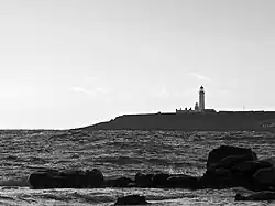 Pladda lighthouse is a white tower with a height of 29 metres.[2] It is the oldest of the Arran lighthouses and situated on the Isle of Pladda just off the Southern tip of the Isle of Arran. Pladda lighthouse is not only the oldest lighthouse around Arran but also one of the oldest lighthouses in Scotland. Pladda lighthouse was built in 1790 by Thomas Smith and showing a lower light from a small lantern 20 feet below the main light to allow seafareres to distinguish Pladda from other lighthouses close by, notably those on the Mull of Kintyre, Cumbrae and Copeland at the Irish coast. The lighthouse was rebuilt between 1821 and 1830. Pladda was one of Northern Lights' lighthouses where paraffin as a new fuel together with multiple wicks were tested successfully in 1870. This allowed substantial savings with a simultaneous increase in power between 10% and 100%. Fog signals were introduced in the 1870s as well. In 1901, the formerly fixed light was changed to a more powerful group-flashing which was Northern Light's plan for most Scottish lighthouses at the time.[3] Pladda lighthouse operates fully automatic since 1990. Pladdas position is 55° 25.512'N, 005° 07.113'W. Its light flashes Fl.(3)30s40m23M.[4]