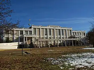 The building is three stories, with a partially sunken first story, and constructed of cast reinforced concrete. The style is similar to that of the main mill buildings, but with Beaux-Arts details. The front and rear of the building have large, multi-pane windows separated by thick concrete columns.[4] Its oversized structural elements led the maintenance staff to say that the building "could probably be rolled end-over-end without hurting it much."[7] The central portion of the façade is raised 6 feet (1.8 m) to add visual emphasis and provide a higher ceiling for the third-floor auditorium. The roofline terminates with a stepped parapet. The center section is flanked by two second-floor entry porticos, each supported by four Tuscan columns. Each floor has a central hallway with classrooms on either side, with restrooms on the ends. The third floor has a large auditorium in the middle with original incandescent lights, that has been converted into a library.[4]
