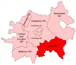 It was formed in 1894 under the Local Government Act 1894, covering the area of the previous Linton rural sanitary district, save for the Essex parish of Bartlow End, which was placed in the Saffron Walden Rural District. It included the parishes of Babraham, Balsham, Bartlow, Carlton, Castle Camps, Duxford, Great Abington, Hildersham, Hinxton, Horseheath, Ickleton, Linton, Little Abington, Pampisford, Sawston, Shudy Camps, West Wickham, West Wratting, Weston Colville, and Whittlesford.[1]