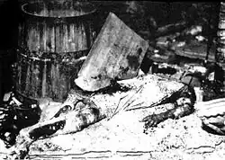 Lightly wounded patients and surviving staff were usually forced to leave the Old Town along with the civilian population. Few managed to survive. Even during the evacuation, SS officers conducted "selections", attempting to identify insurgents hiding among the crowd. Suspected individuals were often executed on the spot. The largest executions occurred in the so-called inter-wall area (Wąski Dunaj Street), where between 70[10] and 100 people,[11] mainly wounded insurgents, were shot. Their bodies were burned, and when Warsaw residents returned to the Old Town in January 1945, they discovered a bathtub filled with human ashes on Wąski Dunaj Street.[12] About 55 people were also executed on Castle Square,[13] and several dozen Jews liberated by the insurgents from the Warsaw concentration camp were murdered on Krasiński Square.[14][15]