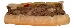 Cheesesteak Nationwide; origins in Philadelphia Made with thinly sliced pieces of beefsteak mixed with cheese on a hoagie roll, with additional toppings often including peppers, onions, and mushrooms