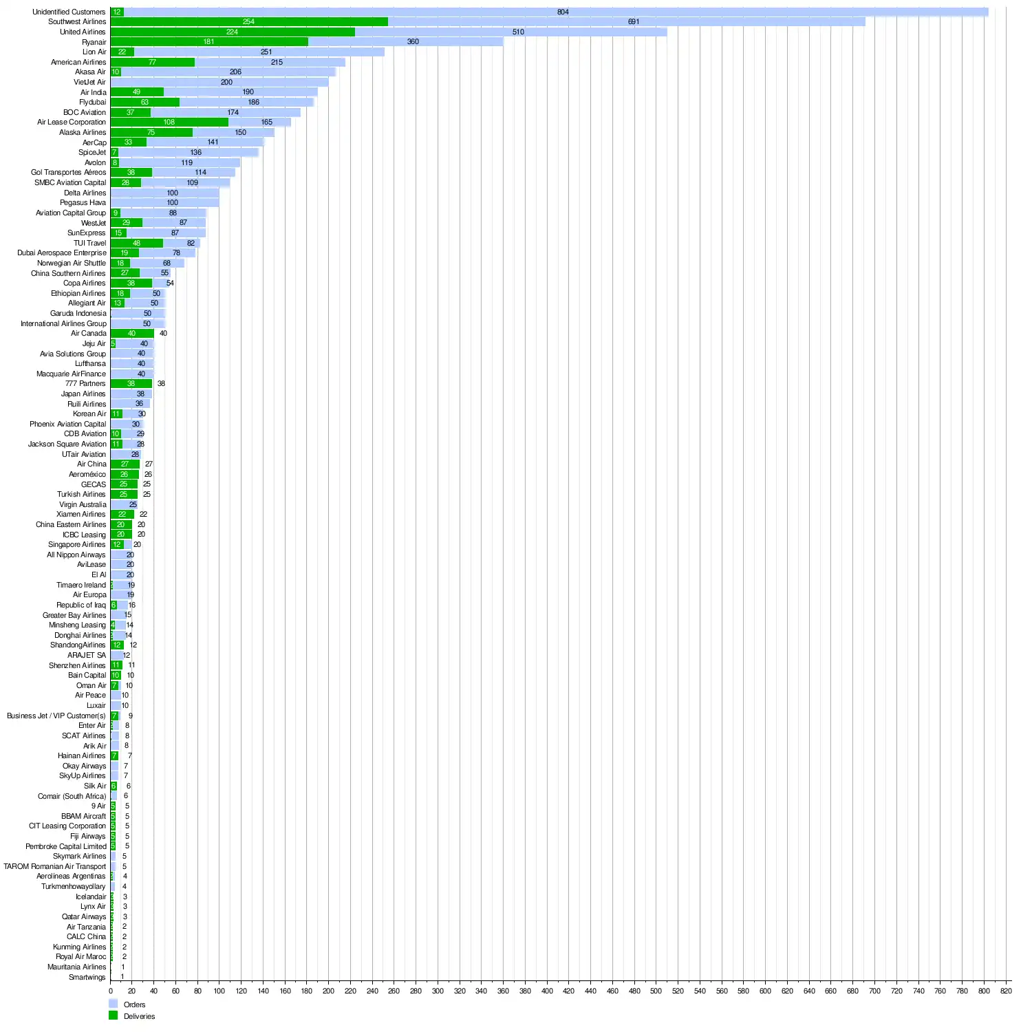 The following table shows total firm orders and deliveries of Boeing 737 MAX aircraft by customer.