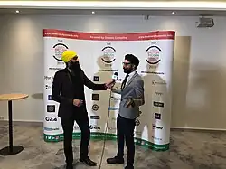 Business professional Param Singh MBE speaking at an awards ceremony with YouTuber 'Flex Singh'