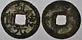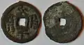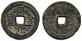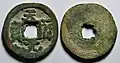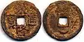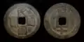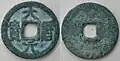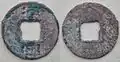 The rebel Gongsun Shu cast iron cash coins based on the Wu Zhu's of the Western Han dynasty in his rebel state of Chengjia in present-day Sichuan:[18]