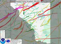 This is a list of tornadoes reported in Cleveland County, Oklahoma. Cleveland County is located in Tornado Alley and experiences tornadoes frequently. The city of Moore is located within the county and has been impacted by four violent tornadoes in recent history; they struck in 1999, 2003, 2010, and 2013.[1] It is one of two places on earth with the most tornadoes per square mile.[2] According to the National Centers for Environmental Information, since reliable records began in 1950, 120 tornadoes have impacted the county, causing at least $2.77 billion (USD not adjusted for inflation) in damages.[3] Tornadoes before February 1, 2007, are rated on the Fujita scale while tornadoes after February 1, 2007, are rated on the Enhanced Fujita scale. The most recent tornado in Cleveland County was an EF1 tornado on May 6, 2024.