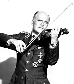 After failing his entrance exams for law or medical school,[5] he received an appointment to a military academy and graduated 95th in his class.[1] Stuck at the rank of colonel for twenty years with an efficiency rating "a few points above miserable", he is the only member of his class still in the Luftwaffe who has not risen to the rank of general. As far as the Wehrmacht knows, no prisoner has ever escaped Stalag 13 during Klink's command, a record he frequently touts. Klink always wears a monocle on his left eye and often carries a riding crop. Klink is, for the most part, portrayed as a cowardly and muddling career officer rather than a stereotypical evil German or ardent Nazi. Klink is easily manipulated by Hogan through a combination of flattery, chicanery, and playing on Klink's fear of being sent to the Russian Front or being arrested by the Gestapo. Although Klink keeps his relationship with Hogan at arm's length, he frequently seeks Hogan's suggestions when faced with professional challenges, which Hogan typically uses as an opportunity to help the Allied cause. Klink is an enthusiastic but untalented violinist.